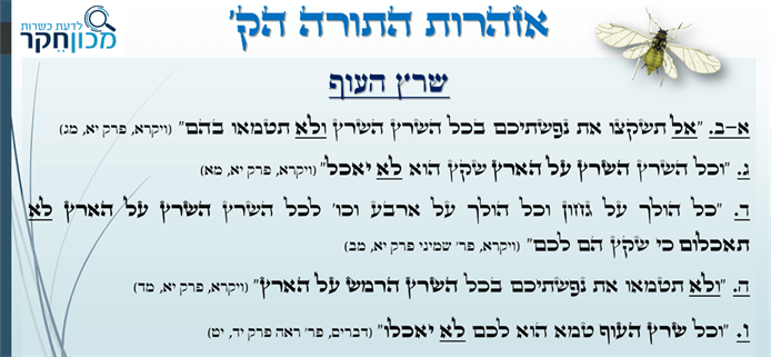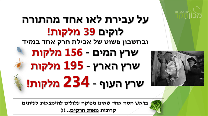 צריך לדעת ולהפנים: הזהירות שלנו מאכילת חרקים מצילה את גופנו, את משפחתנו וחינוך ילדנו, מטומאה ומירידה רוחנית גדולה, גוף האדם בנוי מהאוכל שהאדם אוכל, האוכל נהפך לחומרי בניית תאי הגוף המתחדשים מידי יום בבשרו של האדם, גוף שבנוי מחומרים טמאים אין לו די כוח לעבוד את ה' ונופל בעבירות ללא אפשרות תקומה.