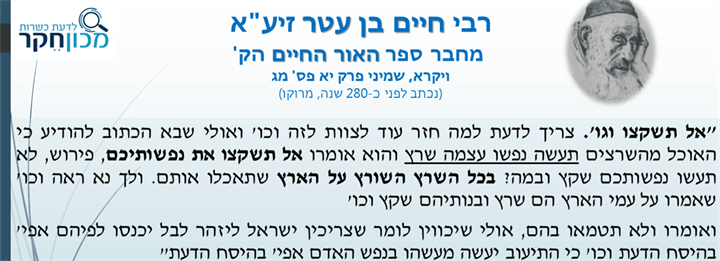 האור החיים הקדוש (רבי חיים בן עטר) שחי לפני כ-280 שנה כתב בפירושו על התורה בחומש ויקרא פרשת שמיני, על הכתוב "אל תשקצו את נפשתיכם" "כי האוכל מהשרצים תעשה נפשו עצמה שרץ" ומביא את הגמרא בפסחים (מט:) שכתוב שם "עמי הארץ, הם שרץ ובנותיהם שקץ" בעבור שאוכלים את השרצים נהיה גופם ממש טמא ולעמי הארץ יחשבו.